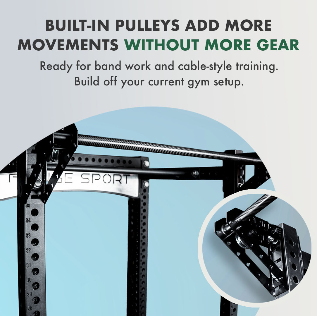 Integrated pulleys expand your bar into a versatile station. Unlock band and cable-style work, with storage to stay organized.