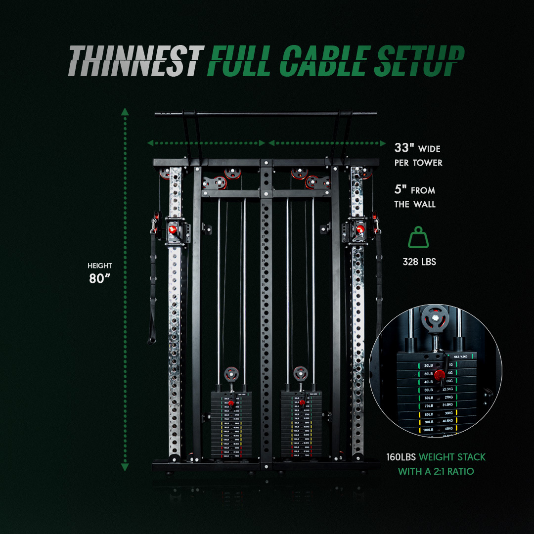 Just 5" deep, 33" wide per tower, and 80" tall, delivering real cable training in spaces bulky machines cannot fit.
