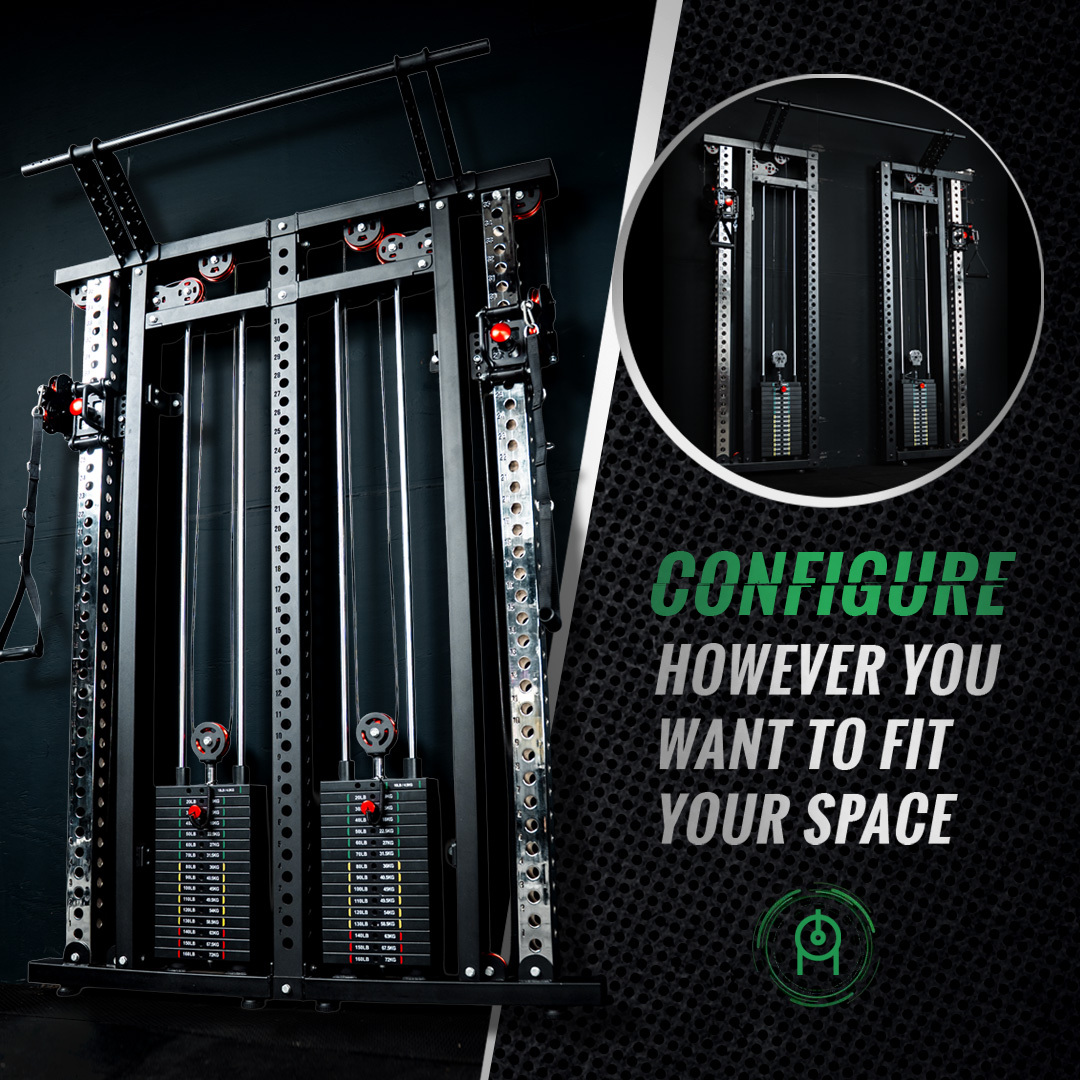Run a single tower for focused cable work. Pair them up to create a functional trainer or crossover station. Add the protruding J-cups and Front Feet to unlock squat rack capability without sacrificing your footprint.