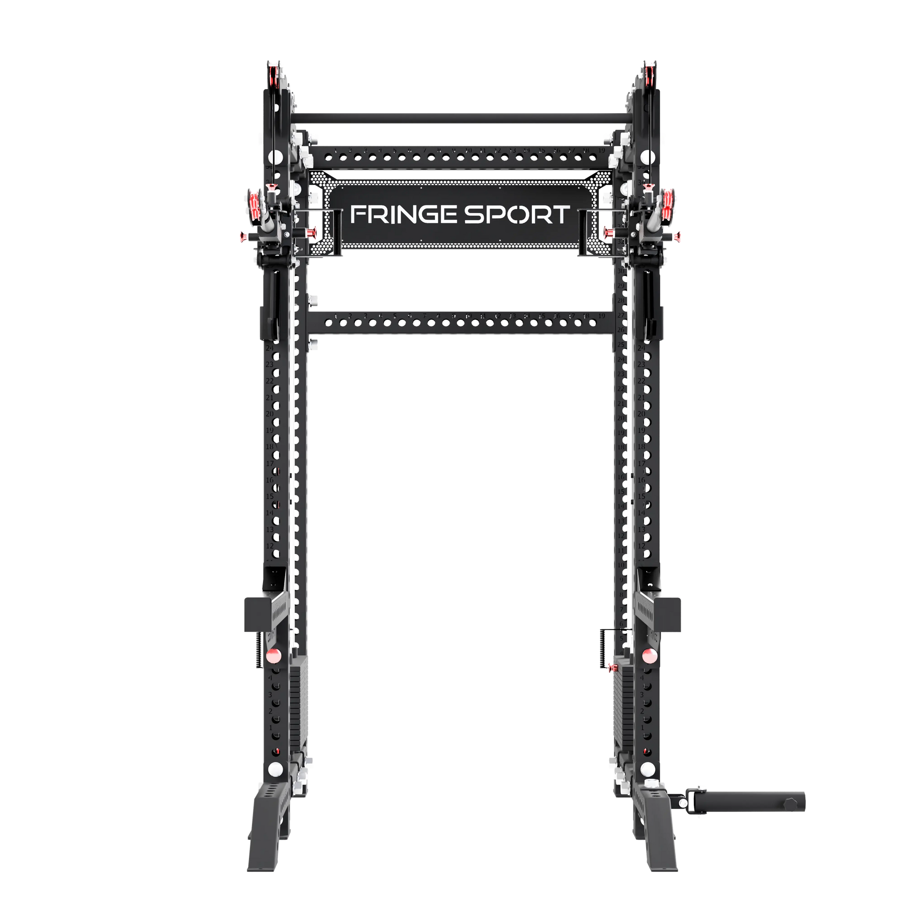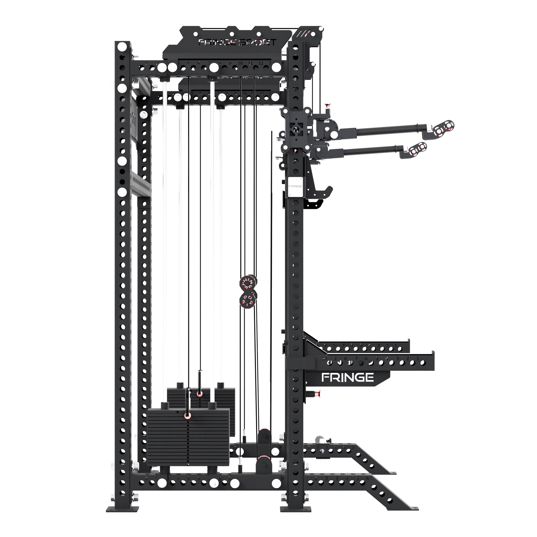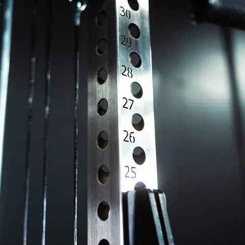 Along with the functional trainer, The Dane 2.0 also features a commercial grade squat rack in the front. Every Dane includes a pair of low-profile spotter arms for squatting outside of the rack and a pair of extension feet for extra stability at the base of the rack while squatting.