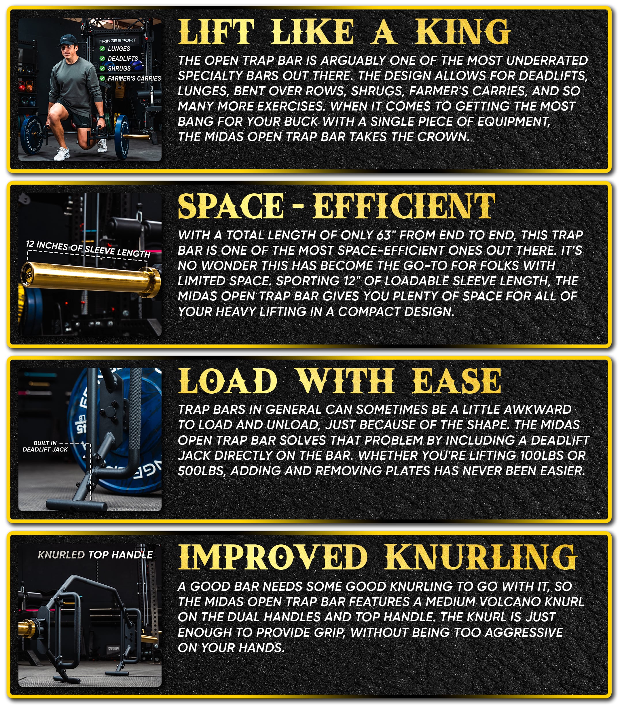 Versatility: Its open design allows for a wider variety of exercises than a traditional bar, including deadlifts, split squats, Romanian deadlifts, weighted carries, and lunges, all while maintaining stability and balance.