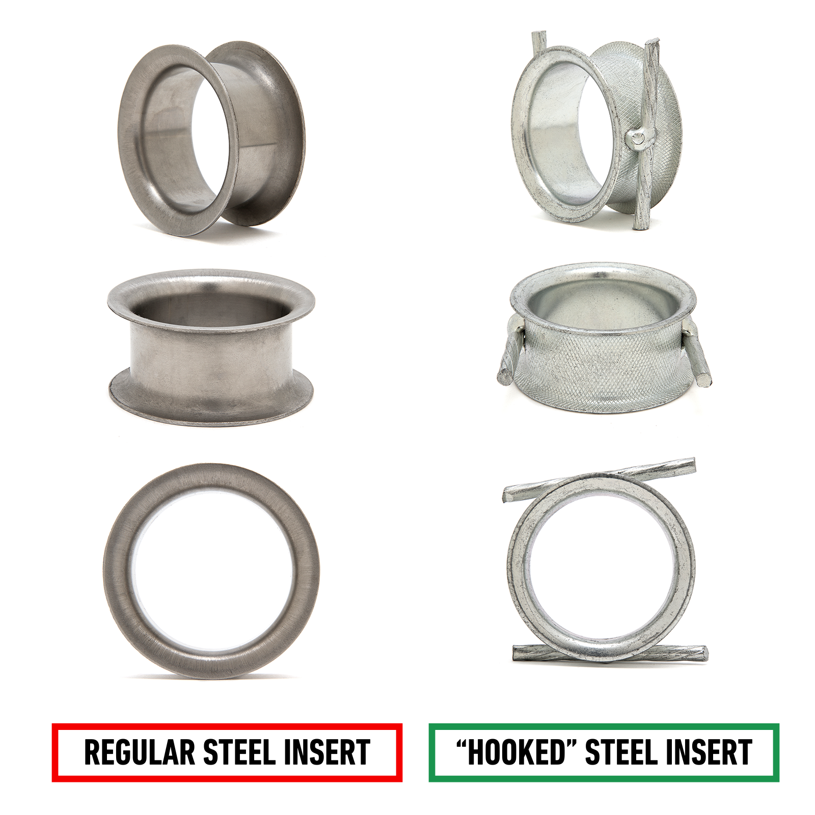 The hooked design distributes stress more evenly across the plate, which helps prevent cracking, chipping, or deformation of the rubber coating. Hooked steel inserts often produce less noise and vibration when dropped compared to plates with regular circular inserts. The secure connection between the hook and the rubber dampens the impact and reduces the rattling or clanging noise associated with weightlifting movements.
