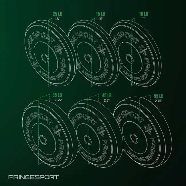 Fringe Sport bumper plates are made from dense virgin rubber which make them quiet and safe to drop on your floors. They’re great for powerlifting, Olympic lifting, or HIIT style workouts.