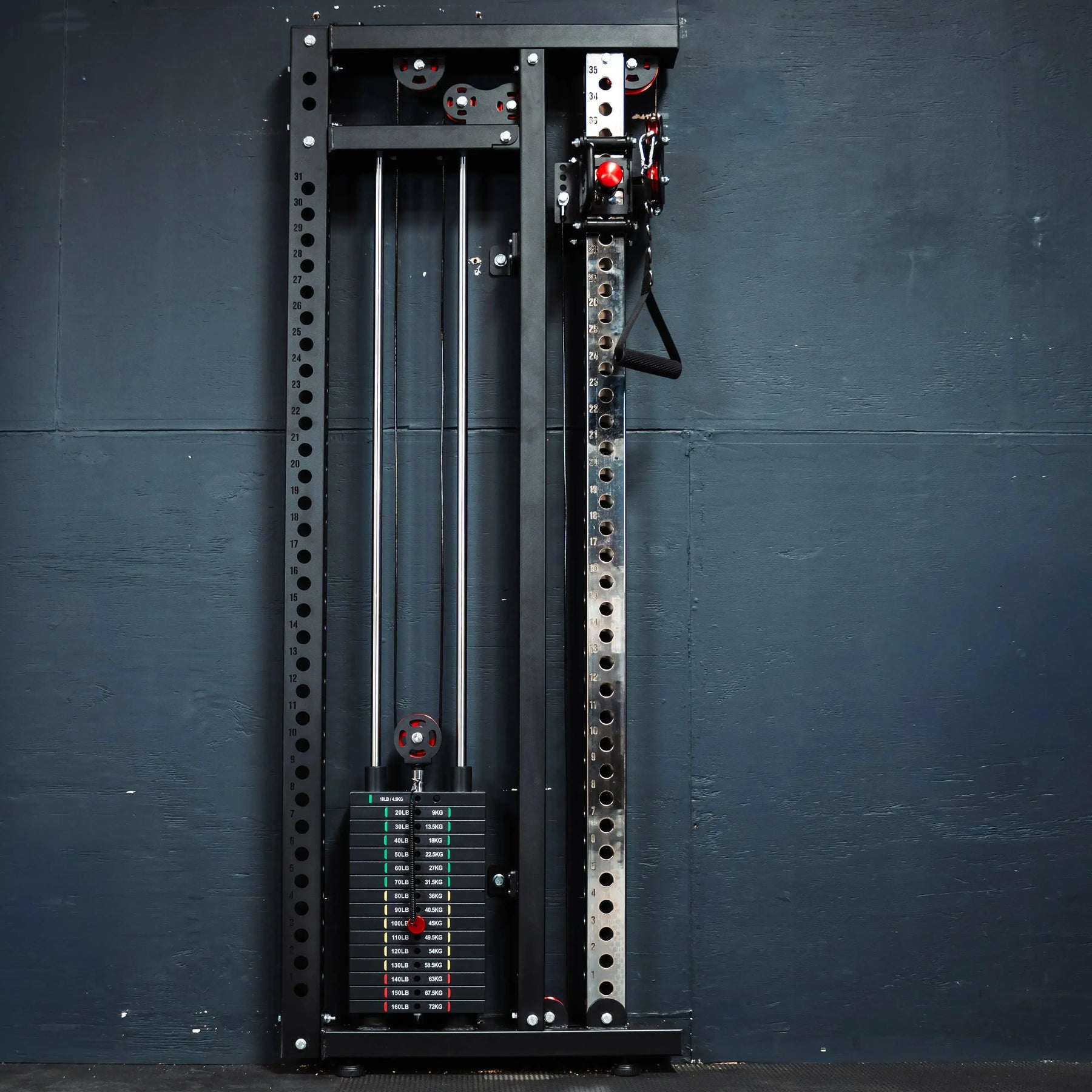 Black powder coat, chrome uprights, Warhawk red aluminium pulleys and pins